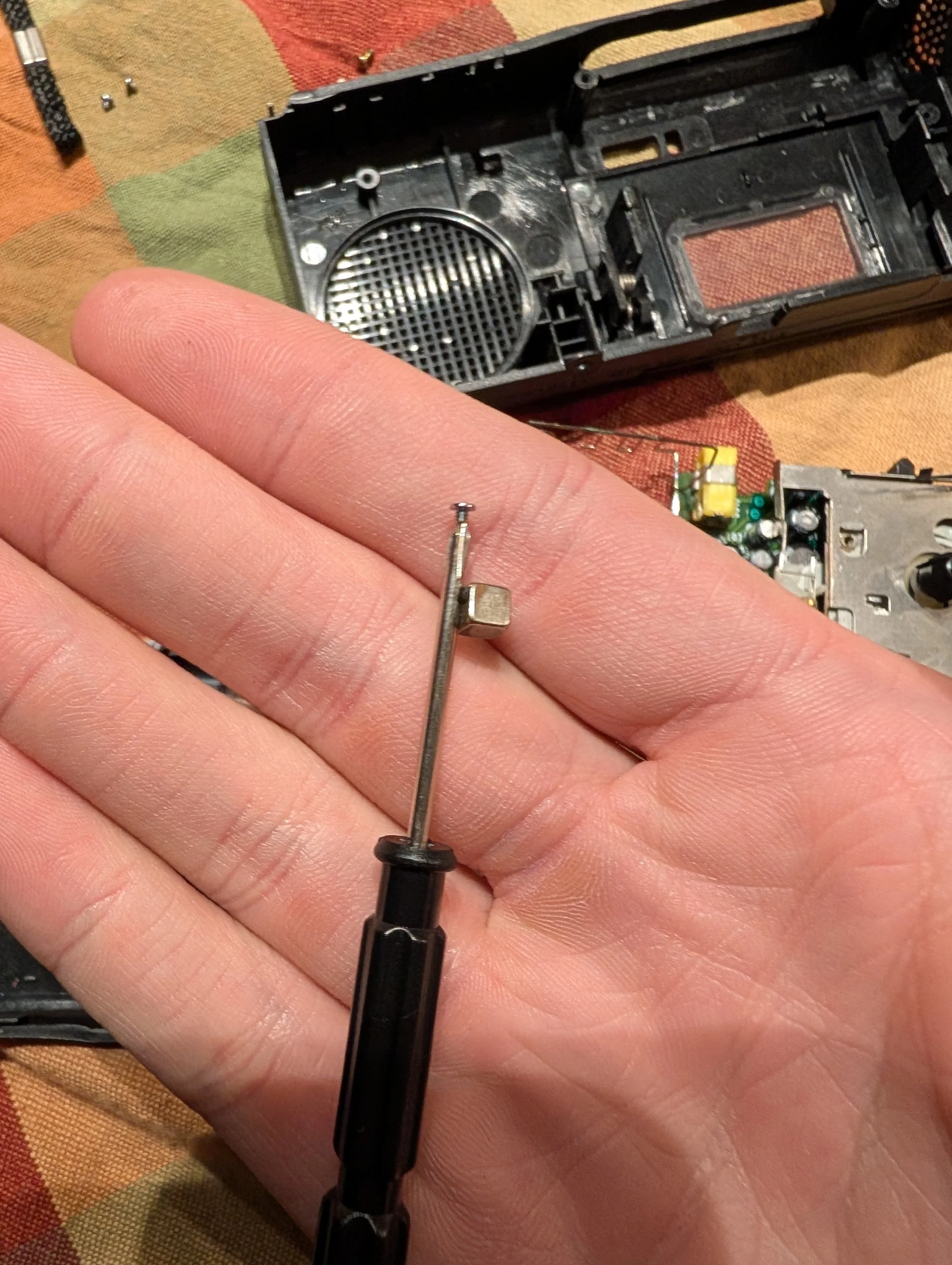 A good trick to use with these small screws is to attach a magnet to the screwdriver so the screw sticks