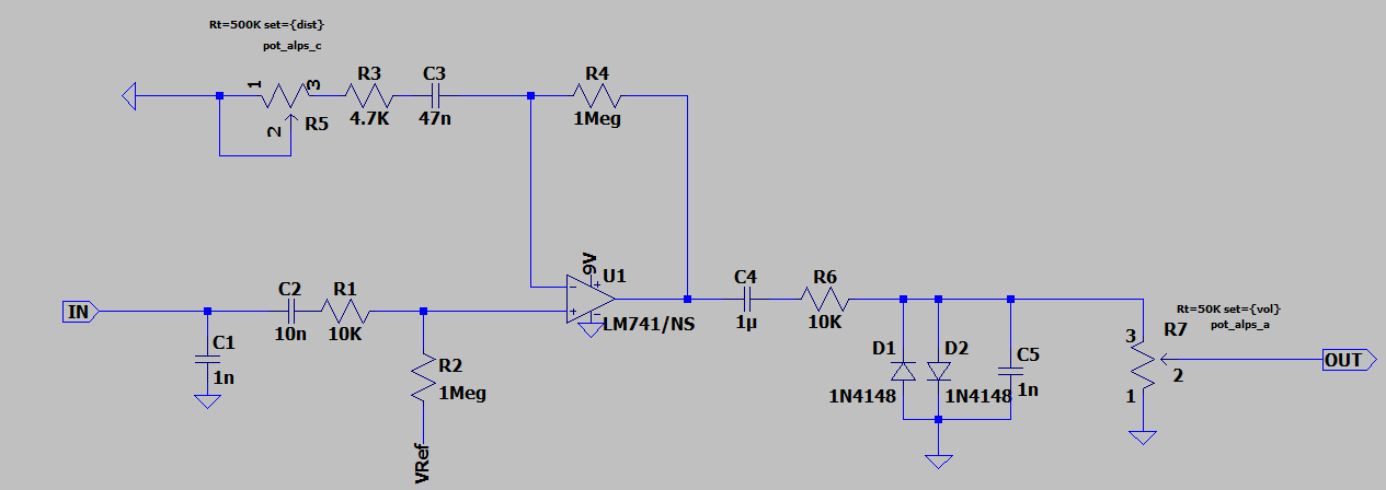 For last weekend’s Makerday, I decided to create a distortion pedal by repurposing the schematic for an mxr dist+. Things seemed to go well at first, I made the schematic in LTspice and ran the simulation, achieving the exact results I was looking for. That being a pretty substantially clipped sine wave, which was supposed to imitate the input of a guitar’s frequency.