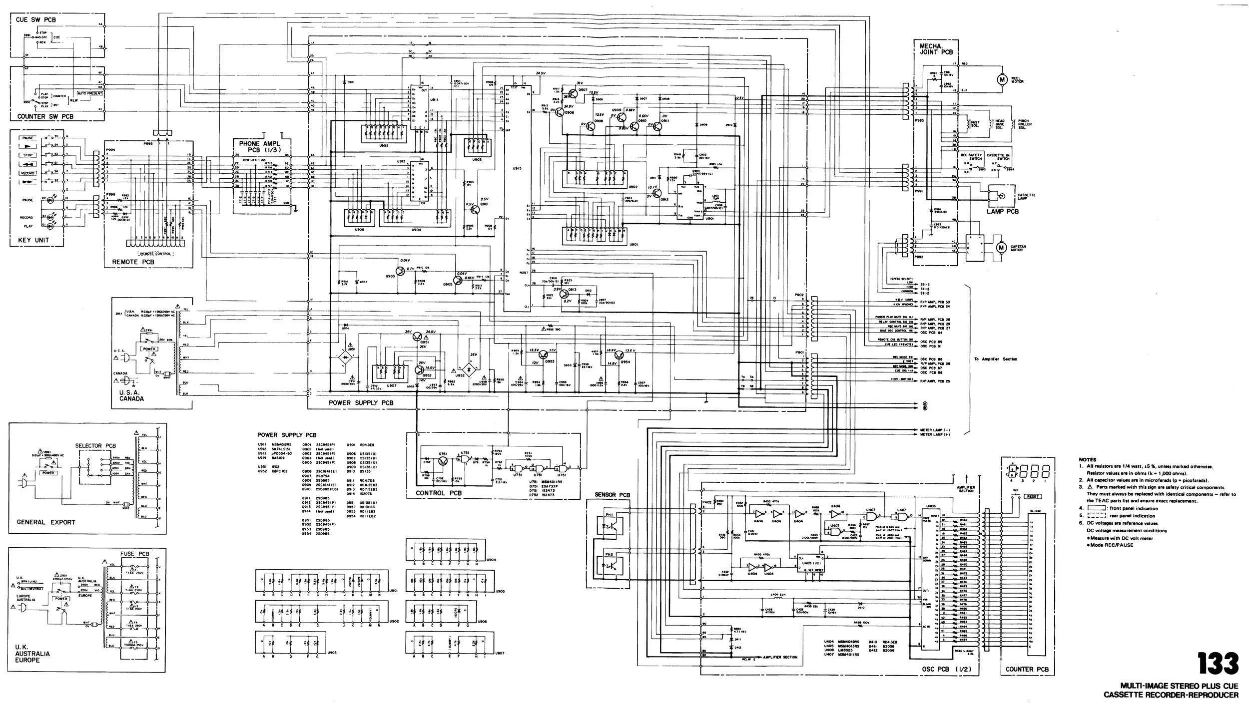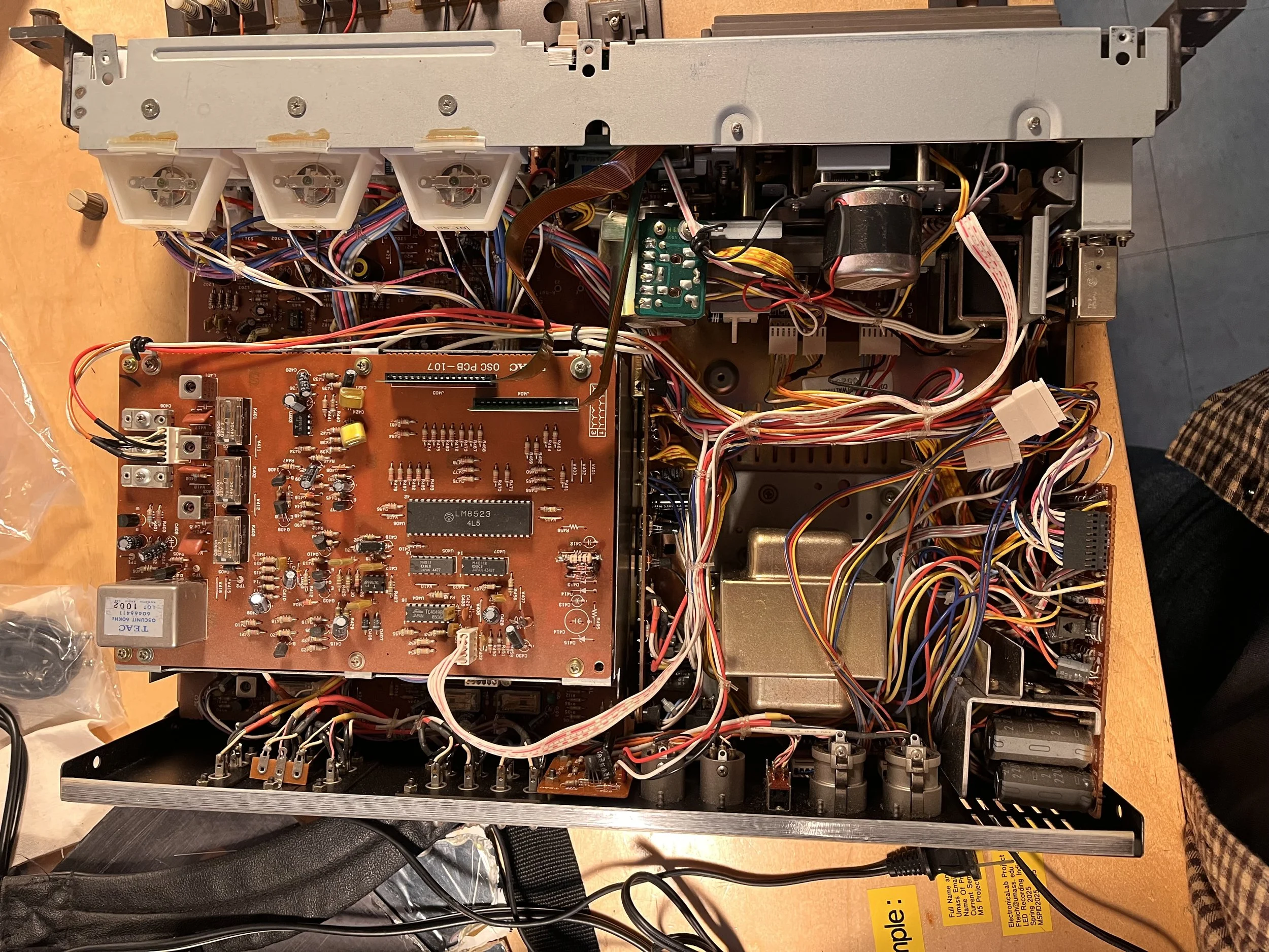 Overhead view of the Tascam 133, here you can see the capstan motor (top right) that drives the control belt which rotates the gears needed to spin the spools of the cassette. There’s also the the main onboard PCBs (bottom left, with three of them stacked) that houses the amplifier circuits, multiplexers, counters, and processors used to time, shape, clean, and boost the analog signals coming in.