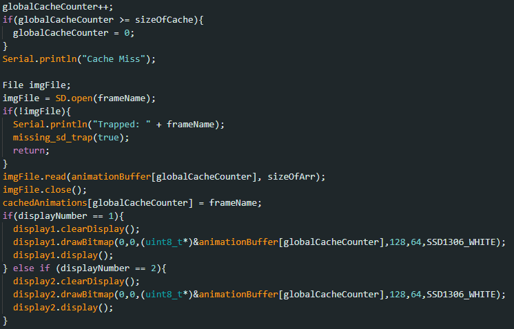 If the cache misses, it loads the desired image from the SD card, andoverwrites the oldest stored image. It also contains a function to catch errors if the SD card fails to read, preventing the system from crashing. This is why it’s still useful to be able to store one image onboard, to display a warning message if the SD card is nonfunctional.