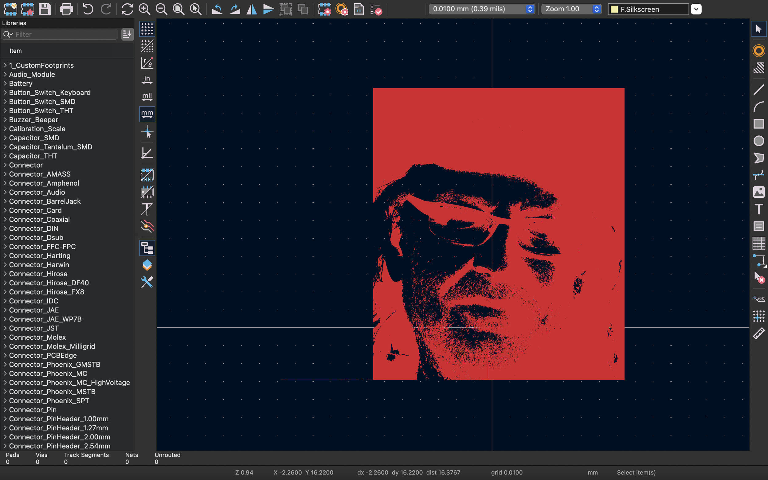 Many people that design PCBs want to include artwork on their boards, whether as silkscreen or a footprint. Most CAD softwares include native support for processing arbitrary images into CAD objects that can be placed on different board layers. I’ll use KiCad for this tutorial, but the general steps are nearly analogous in other design platforms.