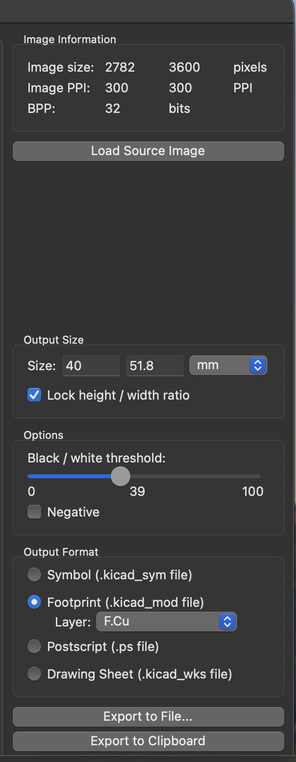 Generally, you want to keep the aspect ratio locked, unless you want the image to stretch in one direction. Change the size to your desired size (you can check this using the measure tool in your PCB). The easiest way to determine the black/white ratio is just to play around with it until the picture looks right. To create a footprint, save the output as a footprint on F.Cu (or B.Cu if you want it on the back of the board). Then click Export to File. Generally, it’s a good idea to keep a dedicated folder inside your KiCad directory for custom footprints, but it’s not required.