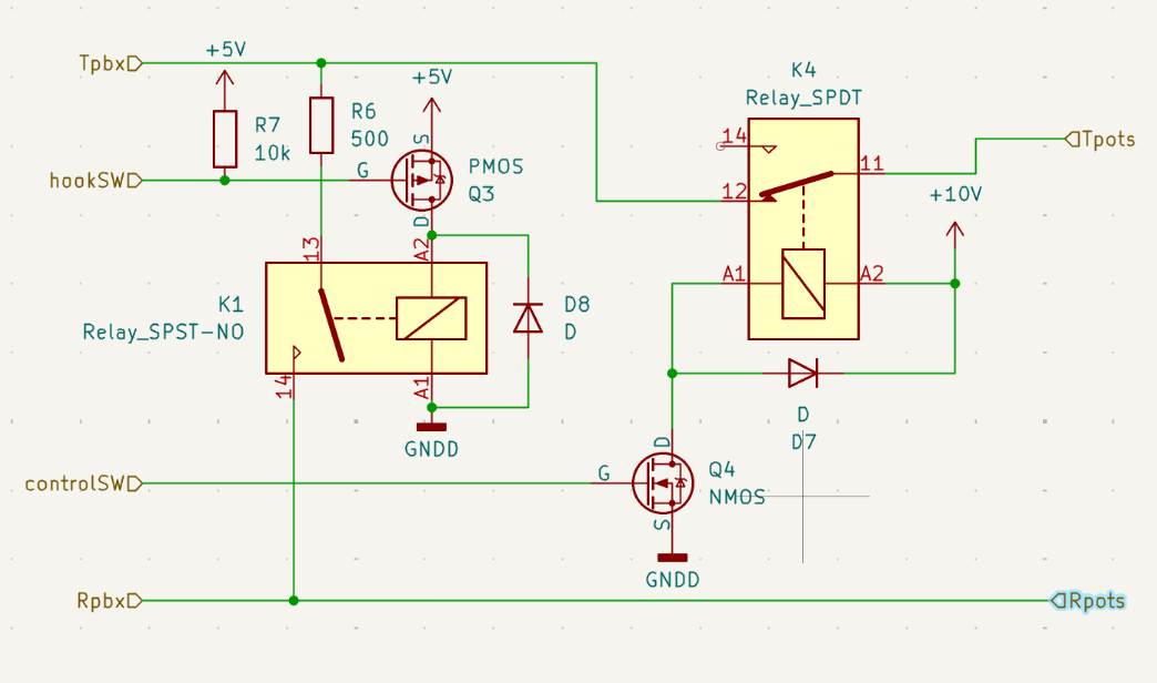 After Ian built his design on a breadboard, I wrote some C code on an STM32 Nucleo board to handle the pulsing logic. The following video shows the two control pins hooked up to LEDs for visual clarity (blue would be hooked up to controlSW in the schematic, and green is hookSW in the schematic):