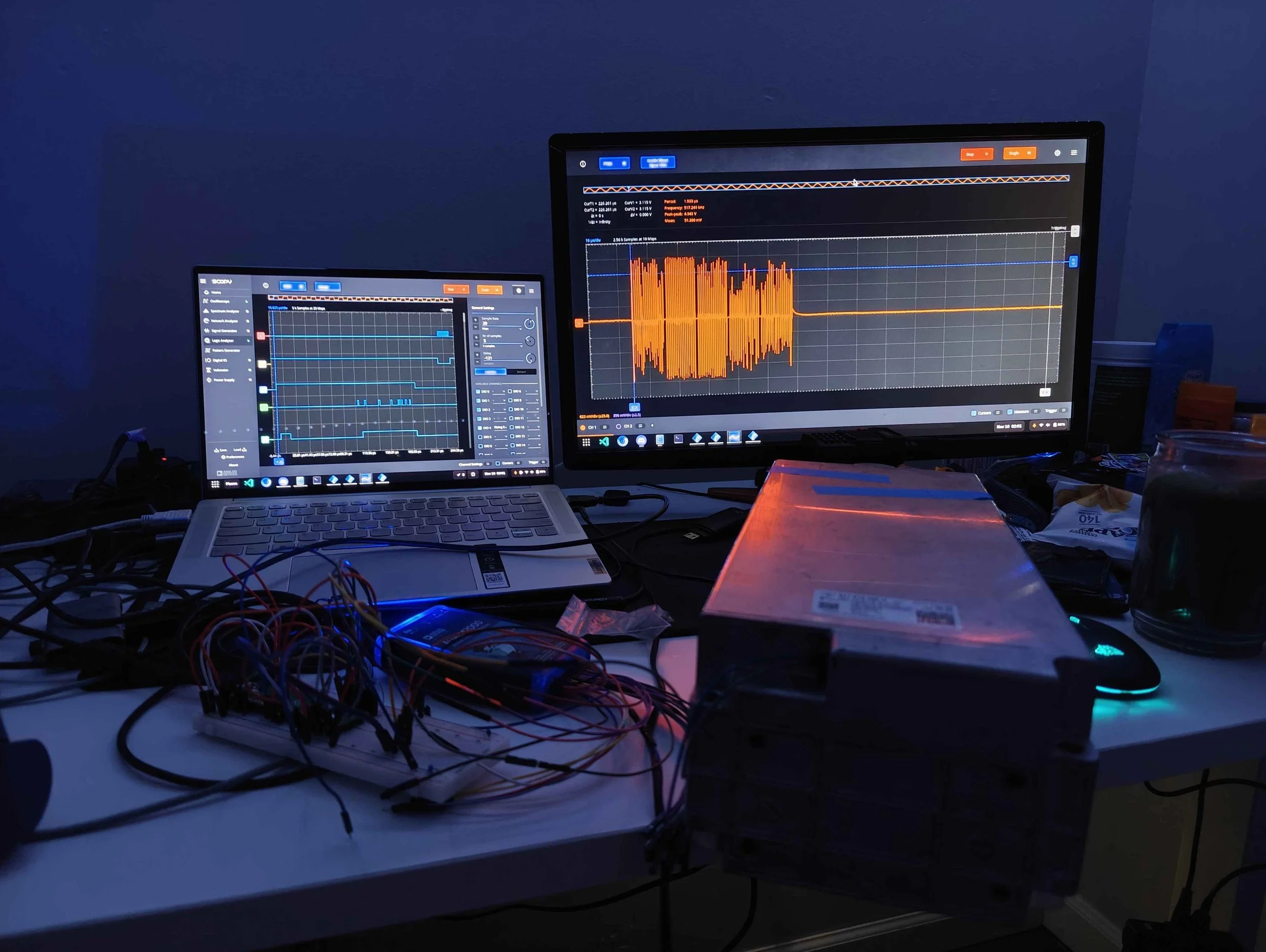 However, something has been very useful to me while debugging this, and that’s ECE 310’s Adalm2000. This device is an all-in-one lab tool, with an oscilloscope function, function generator, voltmeter, power supply, and everything between. With the nature of this TPL communication nightmare, it is actually really useful because I can run the oscilloscope and logic analyzer side-by-side on the same device, and see the TPL signals appear just as the SPI pins are clocked. This has confirmed that my message encoding should be up to spec, and leaves me with few options to explore in the process of conquering the communication of this thing.