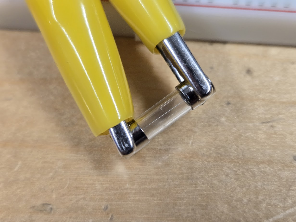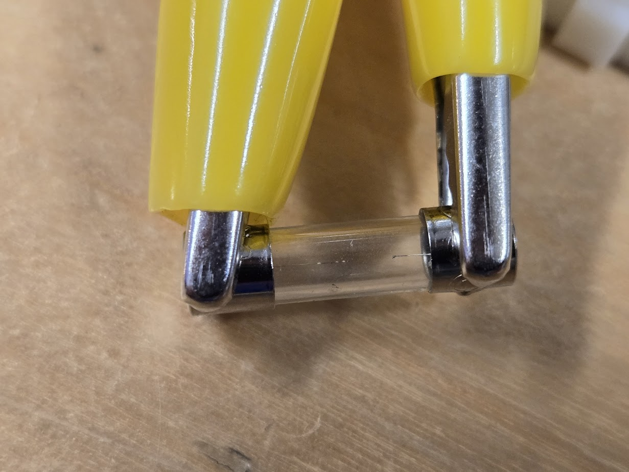 When the switch is toggled, the power from the MOSFET is shorted to ground. The fuse blows, and the green LED indicates that the load is not receiving any power.