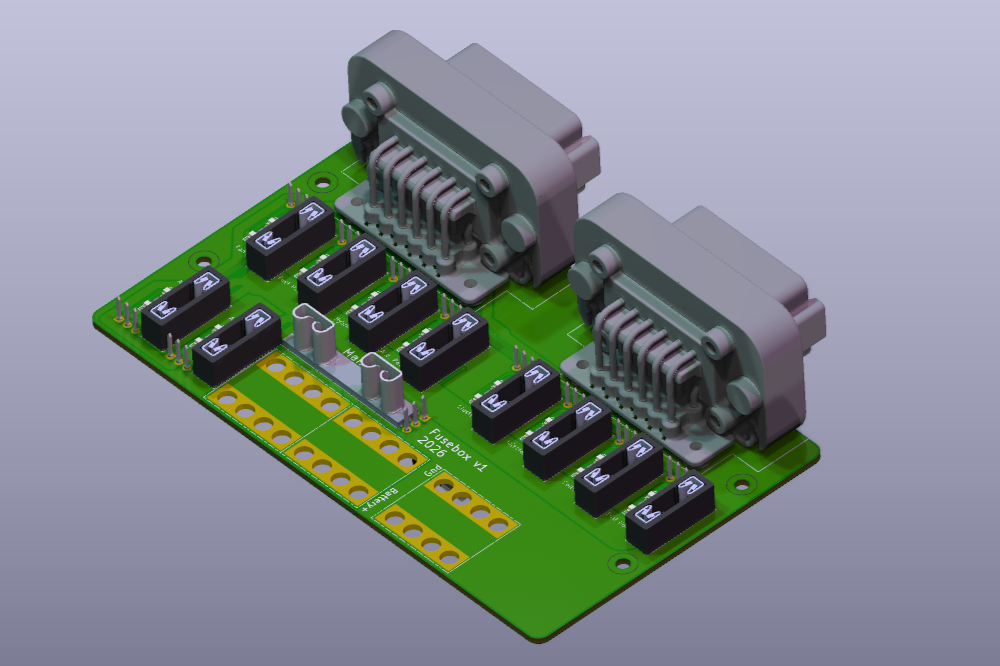 While working on my Senior Design Project, I found myself in need of a relay/fuse box to switch various electrical components. Rather than spend a few hours and a few dollars wiring and crimping everything by hand, I thought it would be a much better use of my time to spend far more effort and money to make a PCB using high quality components and connectors. While I’ve spent far longer on it that I initially expected, the benefit is that I can use high-current transistors as a reliable way of delivering current and can scale the design quite easily.