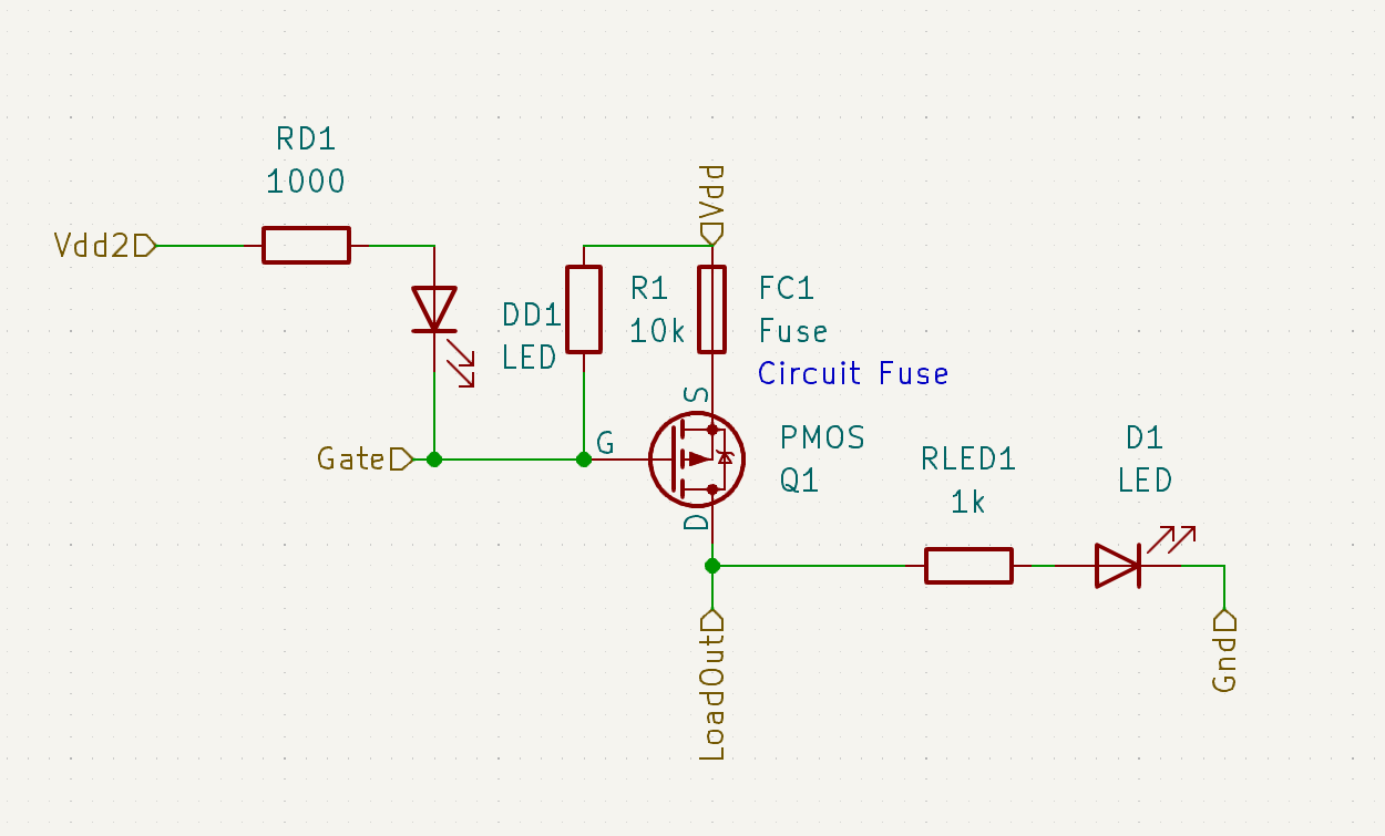 Since it’s usually never good practice to order a PCB of a circuit which hasn’t been tested on a breadboard, I decided to build one of these drivers and test it out. In the video, the load is powered (green LED) when the gate of the MOSFET is pulled low (red LED). When the load is shorted to ground and too much current is allowed to flow, the fuse will pop. When the load is not receiving any power, the red LED will still illuminate, but the green one will not.
