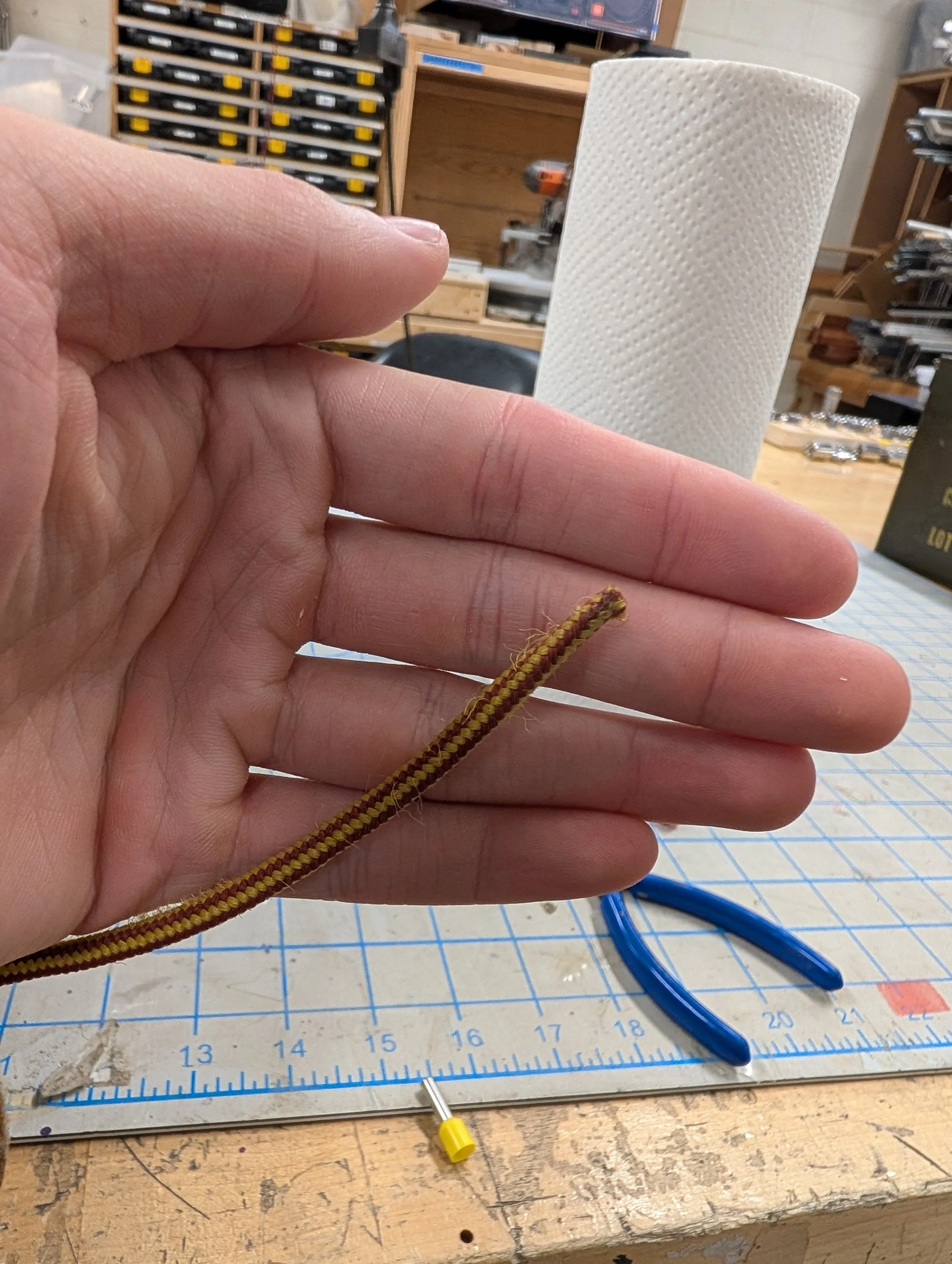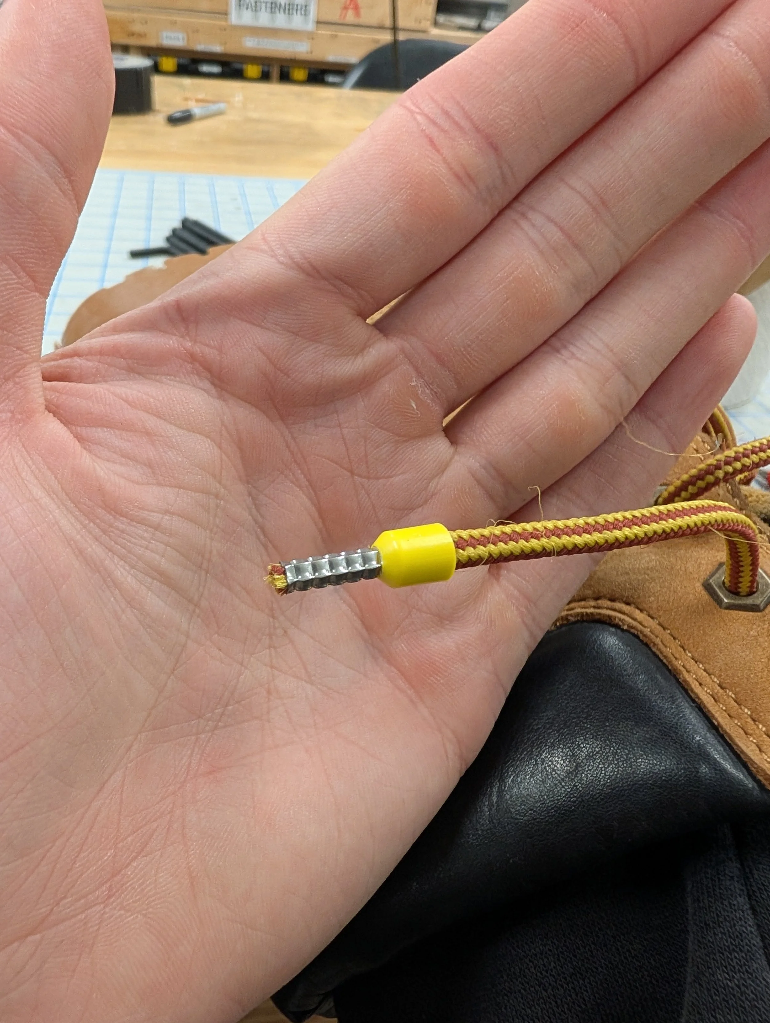 We have all faced this issue before, when the plastic thing on your shoelace falls off and now you need to go buy new laces. However this time I had the limitation of not having a car to easily go out and buy one, and no funds to go on amazon and get some delivered. Forced with this roadblock I turned to the largest supply of things on campus I know. There are so many things at M5 that arent limited to their only use case.