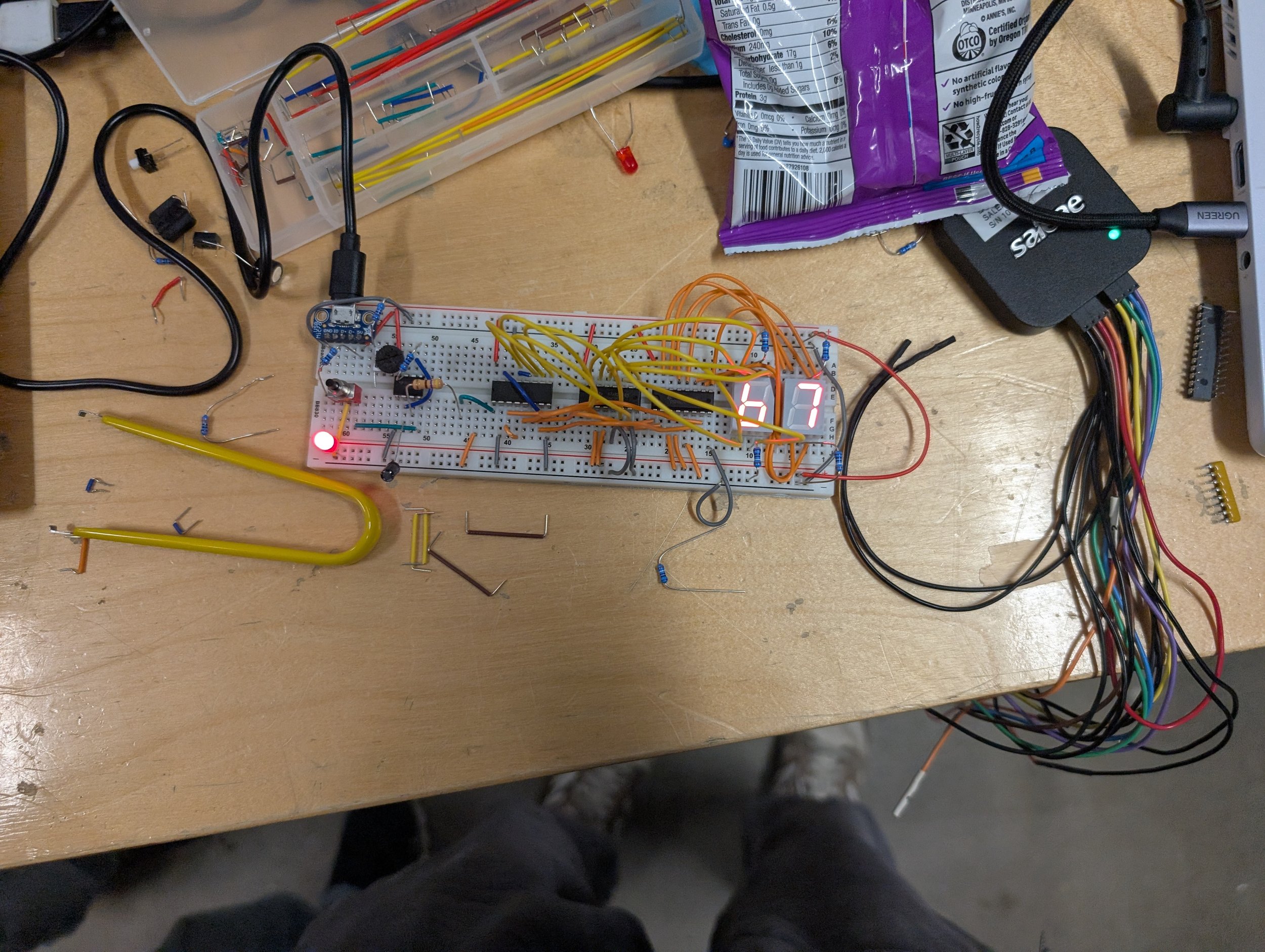 This Saturday, despite the buzz around HackHer, students still came to M5 to learn about digital logic, and build their own stopwatch timers! This design uses a 555 timer integrated circuit in astable mode to generate a square wave at around 1 Hz, which is then fed into a dual decade counter IC, and is finally displayed on two seven-segment displays, each driven by an IC that converts from BCD to 7 segment.