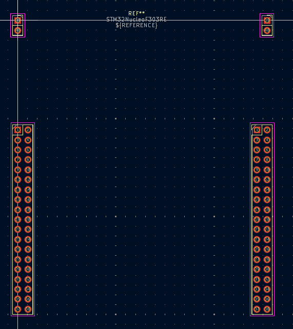 The footprint I made for the STM32 Nucleo, which also includes the two 1×2 ground connectors on the top for added support.