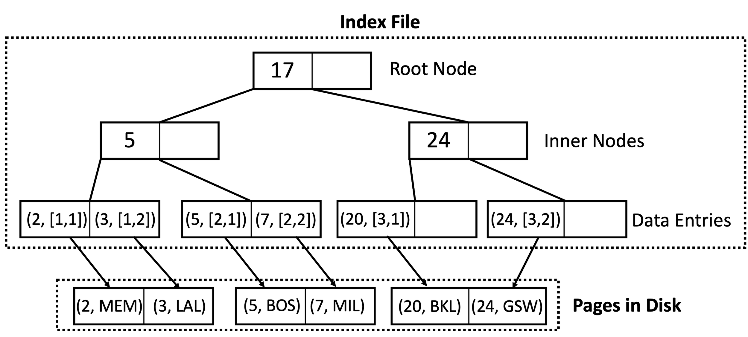 Why is this important to memory you may ask? B trees and B+ trees (B trees that allow for faster search through nodes) can significantly speed up memory retrieval. Instead of loading specific items into RAM, B trees search quickly from top to bottom of the "tree" shown below to load up the range the address is in, which takes much less time since pages of data can often reach up to 1000 bytes. By loading a page into memory, the cache and CPU can find the data much faster since it already knows the range.