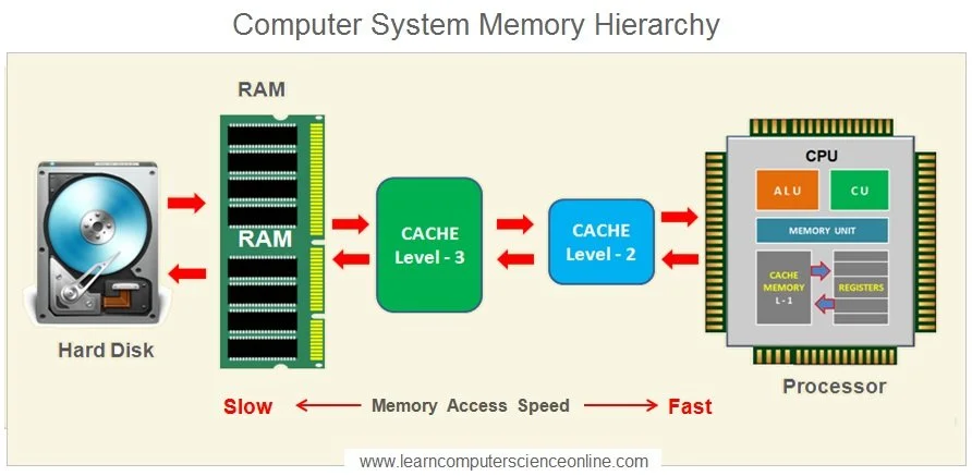 In computers, it is computationally expensive to look through disk memory since it can take thousands of clock cycles to look through the data to find the information the CPU is searching for. For this reason, computer engineers created the memory hierarchy system, which keeps locally used data close to the CPU by loading it first into the RAM, or random access memory, while caching is used to keep recently used data close to the CPU to speed up processing time.